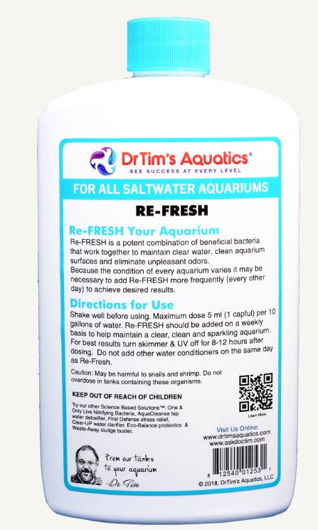 Dr.Tim's Re-Fresh is a potent combination of beneficial bacteria that work together to maintain clear water, clean aquarium surfaces and eliminate unpleasant odors. Re-Fresh revitalizes green or brown aquarium water and keeps your water crystal clear!