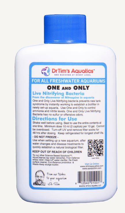 One and Only Live Nitrifying Bacteria prevents new tank syndrome by instantly working to establish a biofilter in newly set-up aquaria. Use One and Only to control ammonia and nitrite levels. One and Only Live Nitrifying Bacteria has no sulfur or other offensive odors.