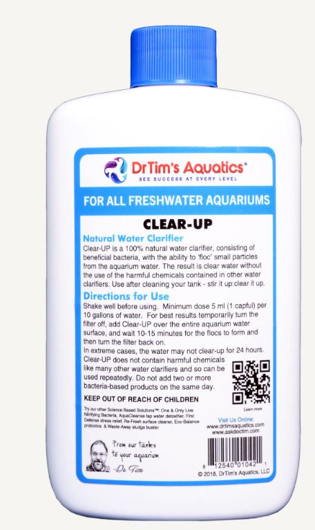 Clear-UP clears cloudy white water. Clear-UP is a 100% natural water clarifier consisting of beneficial bacteria, with the ability to "floc" small particles from the aquarium water.