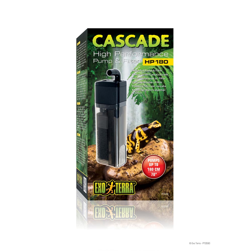 The Exo Terra Cascade is a high performance submersible pump with filter, specifically designed to create waterfalls or cascading streams up to a maximum height of 180 cm (70”). The Exo Terra Cascade enables you to implement your own creative ideas and designs in the construction of a waterfall or water course in your terrarium. The extreme pump height of 180 cm or 70” allows you to create a large single step waterfall flowing from the top of your terrarium in to a water reservoir below, or a multiple step cascade resembling a series of mini waterfalls that descend in to a meandering stream at the bottom of the terrarium. You can also use the Cascade High Performance Pump to pump water to the top of the terrarium to constantly irrigate the terrarium background, creating a perfect environment for all kinds of lichen and mosses, ferns, vines, bromeliads, orchids and epiphytic plants. An eye-pleasing waterfall or cascading creek in your terrarium is not only esthetic and and relaxing for the observer, it also contributes to the environment’s overall humidity level. Many reptiles and amphibians enjoy the humid microclimate in the direct vicinity of the cascade or stream to soak up moisture. The permanently cascading flow of fresh, aerated water stimulates the natural drinking behavior of reptiles and amphibians.