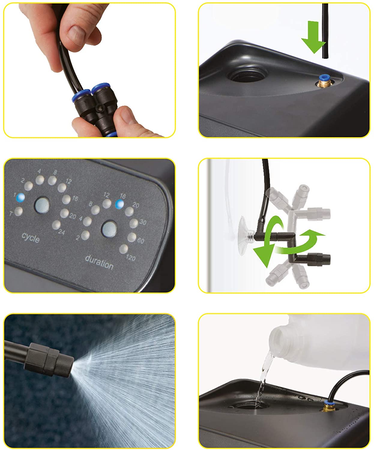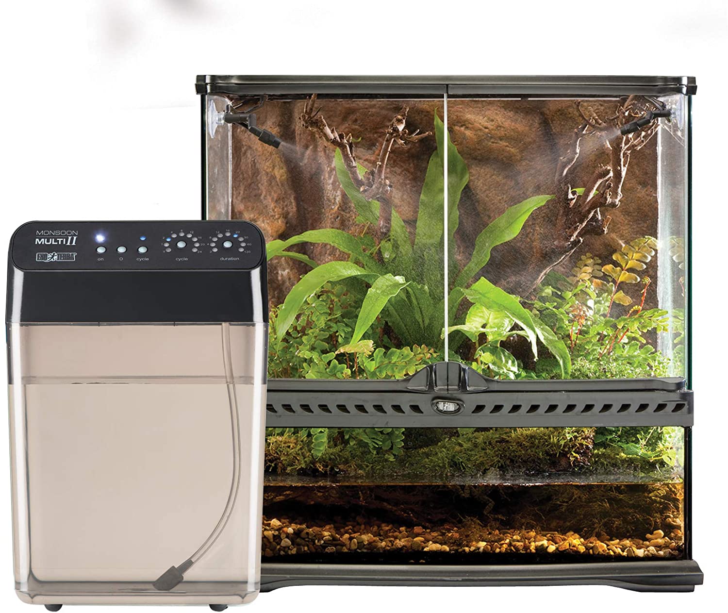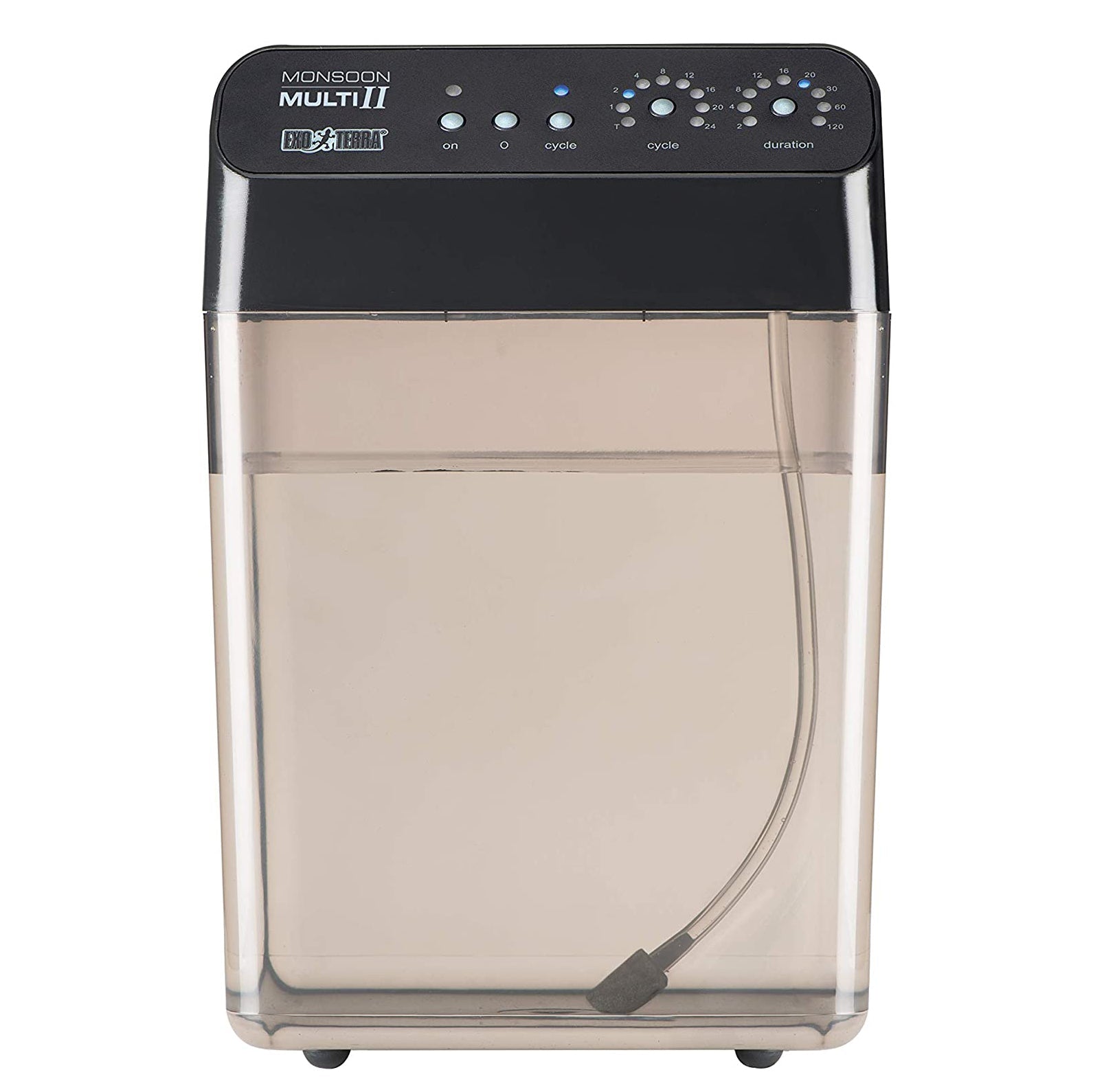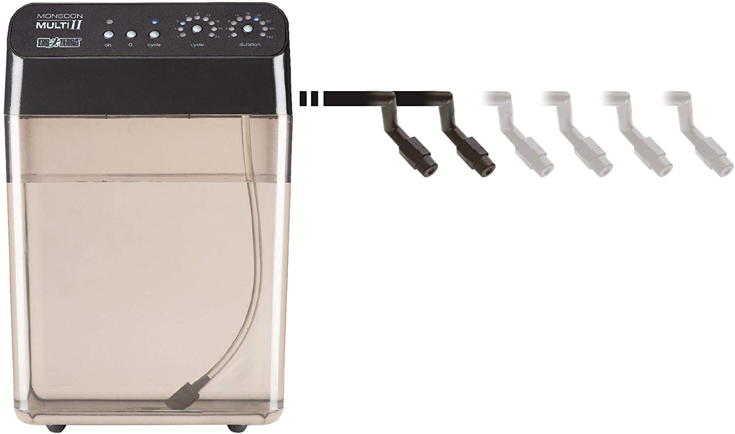 Programmable misting system for terrariums and greenhouses. Strong 65,25 PSI / 4,5 Bar water pressure pump Large 2 gallon reservoir Pressure resistant polyether tubing & leak-proof connectors The Exo Terra Monsoon MULTI is a programmable misting system suitable for all types of terrariums and greenhouses. It helps maintain optimal humidity by generating a fine mist at programmed intervals, the duration and frequency of which can be easily adjusted depending on the type of animal or plant housed. Frequent misting helps stimulate breeding behaviour, and is a necessity when housing live tropical plants such as Bromeliads, orchids, mosses, etc. The system can be programmed to mist multiple times per 24-hour cycle, with spray durations ranging from 2 seconds up to 2 minutes. The large 8 liter (2 gallon) reservoir ensures continuous operation for several days without the need for refilling (ideal for vacations!), and the reservoir can be easily replenished without needing to uninstall the entire system. The Exo Terra Monsoon MULTI comes with two easy-to-install nozzles, but the system can be extended to accommodate up to 6 nozzles, making it ideal for multiple terrariums. (Please note that every additional nozzle will result in less performance from each nozzle installed.) The mist produced by these specially designed nozzles is extremely fine, creating a fog-like effect in the terrarium or greenhouse, and the extra long tubing makes it possible to conceal the unit in a storage area or under the terrarium in a cabinet.