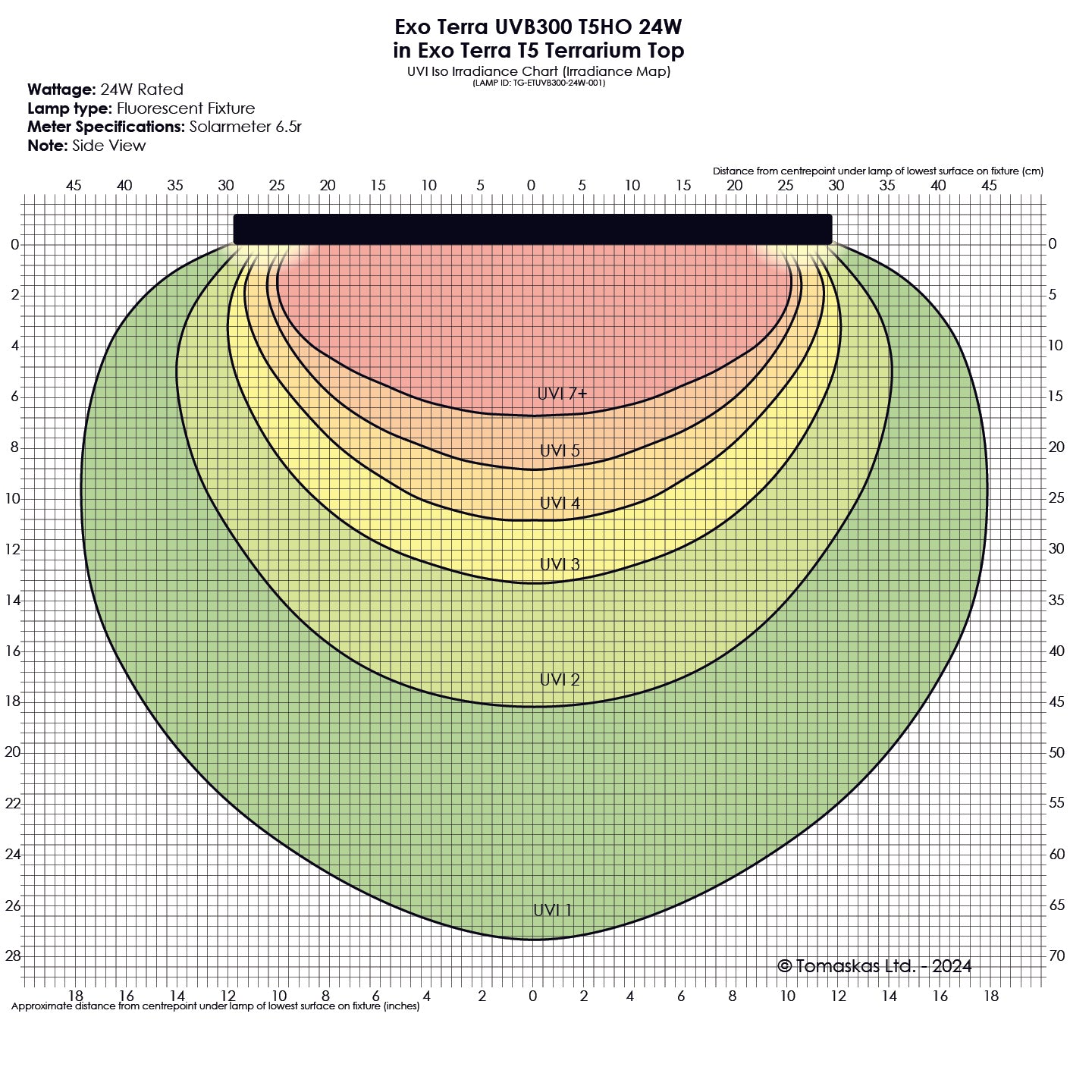 Exo Terra®’s exceptional T5 lamps are crafted in Germany to the highest quality standard, ensuring a prolonged UV output of 12+ months for lasting performance. With its intense output of UVA and UVB rays – combined with a well-balanced visible light spectrum – the Exo Terra® Reptile UVB300 T5 Very High Output Bulb is specifically designed to meet the needs of reptiles basking in open or midday sun in the Euphotic or Heliophotic Zones. The intensity of the emissions varies depending on the distance from the basking area.