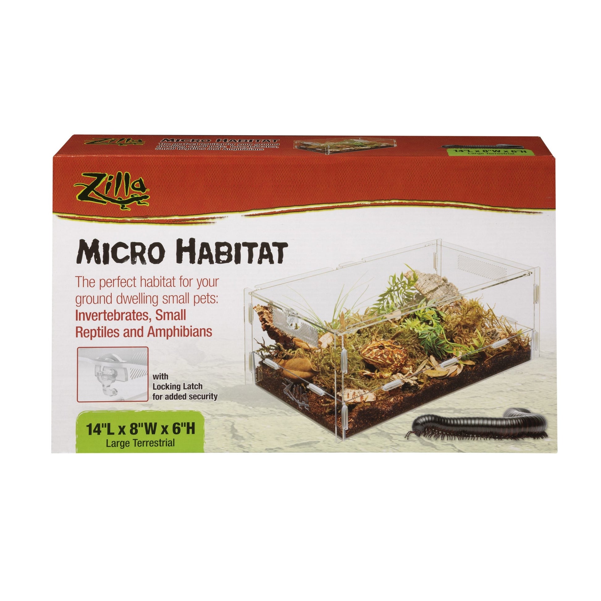 Zilla® Micro Habitats are perfect homes for your small reptiles and amphibians or invertebrates. They make perfect temporary habitats for observing the unique invertebrates you find in your back yard. Easily assembled to when needed, then broken down and stored when not in use. Crystal clear acrylic allows for views from all angles. Designed with a unique locking latch and added stability, these habitats create a secure home for your pet.